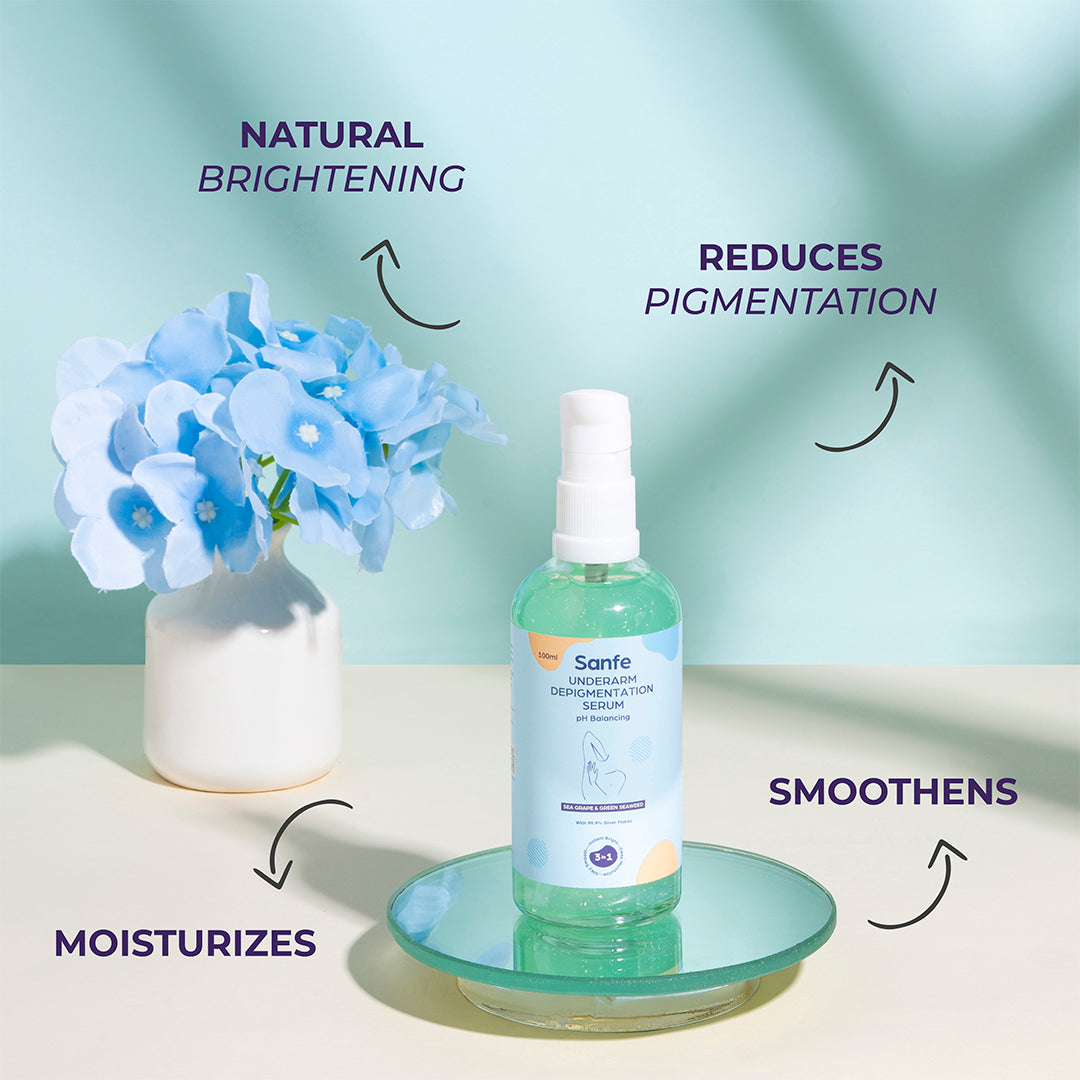 • Sanfe Underarm Depigmentation Serum is the summer friend you have been waiting for. It helps fight skin issues and gives you a clearer spotless skin. The formulation helps in treating pigmentation, dark spots and hydrates your skin.