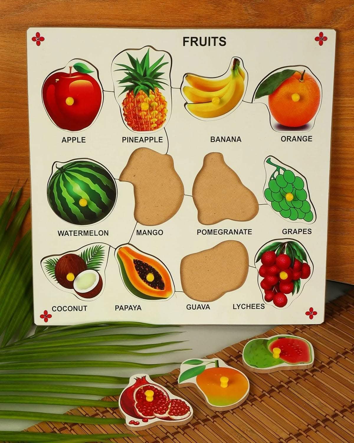 AV MART Kids Educational Fruit Name Puzzle on Wooden Board (12 Different Fruits) (12X12 INCH)