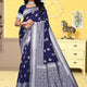 - Radiate sophistication with this Navy Blue Banarasi Silk Saree, gracefully adorned with silver zari motifs that shimmer with timeless elegance. The deep blue shade symbolizes royalty, while the intricate silver zari weaving across the saree adds a refined charm, perfect for both traditional and festive occasions.