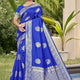 - Unveil your royal charm with this Royal Blue Banarasi Silk Saree, an epitome of timeless grace and grandeur. The luxurious blue tone radiates confidence and poise, while the silver zari motifs shimmer beautifully across the drape, adding a regal touch to your ensemble.