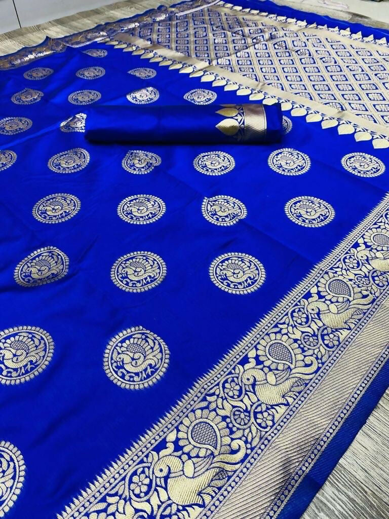 AXONIT Classic Royal Blue Banarasi Silk Saree with Silver Zari Border