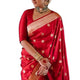 - Step into timeless beauty with this Royal Red Banarasi Silk Saree, a perfect blend of tradition and sophistication. Crafted from luxurious soft silk, the saree features rich golden zari circular butti motifs spread gracefully across the body, creating an aura of festive opulence.