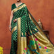- The deep emerald green body is adorned with elegant golden polka motifs, exuding richness and sophistication. Its grand pallu, featuring intricate peacock and floral weaving in gold and multicolor threads, tells a story of timeless Indian artistry.