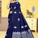 - Exude timeless charm with this mesmerizing Navy Blue Banarasi Silk Saree, a masterpiece that combines traditional artistry with modern sophistication. Crafted from premium Banarasi silk, this saree showcases exquisite silver zari weaving that adds a royal gleam to its deep navy base.