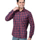 - Color & Pattern: Features a dominant, rich Red base color overlaid with a classic, high-contrast chequered (plaid) pattern in deep Navy Blue or dark indigo, accented by thin white lines. This traditional palette gives the shirt a distinctly smart-casual or lumberjack-style feel.