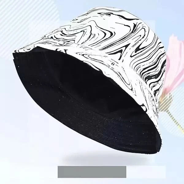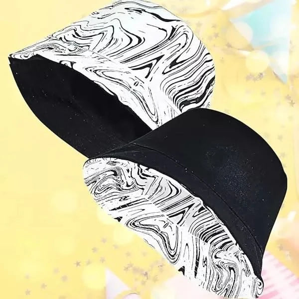 • Versatile Reversible Design: This stylish bucket hat features a reversible design, offering two distinct looks with a unique black and white liquid print on one side and a solid color on the other, allowing you to switch up your style effortlessly.