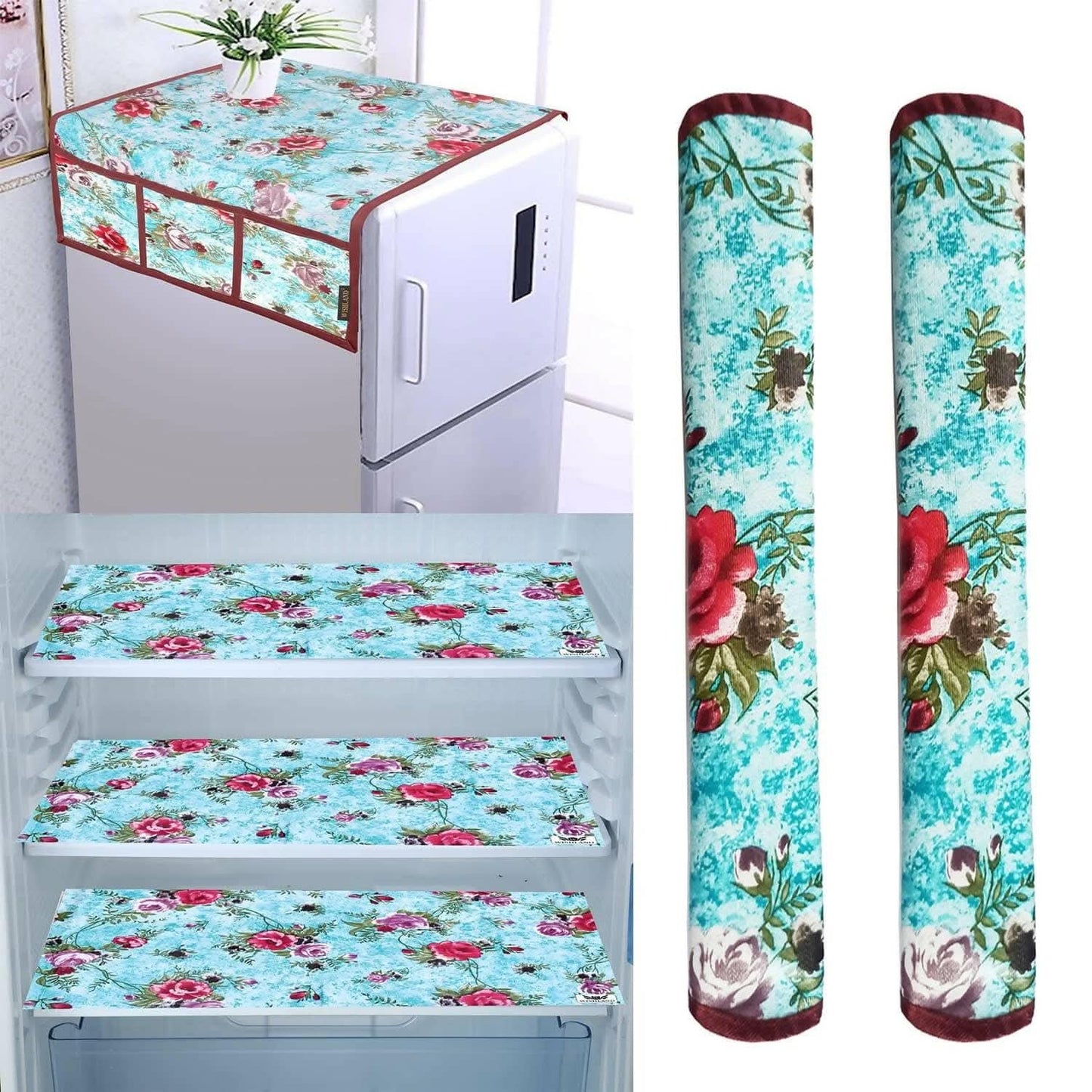 WISHLAND Single Door Fridge Cover Combo Set pf 1 Fridge Top Cover + 2 Fridge Handle Cover + 3 Multipurpose Fridge Mats (Blue)