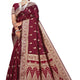 - Crafted in rich maroon jacquard silk, this saree features intricate gold zari weaving throughout its border and pallu, adorned with regal floral and paisley motifs. The body is beautifully decorated with delicate buti patterns that add a graceful texture and shimmer, making it ideal for weddings, receptions, and festive occasions.