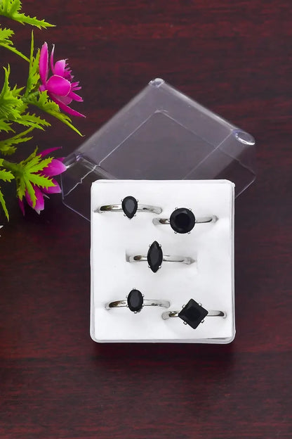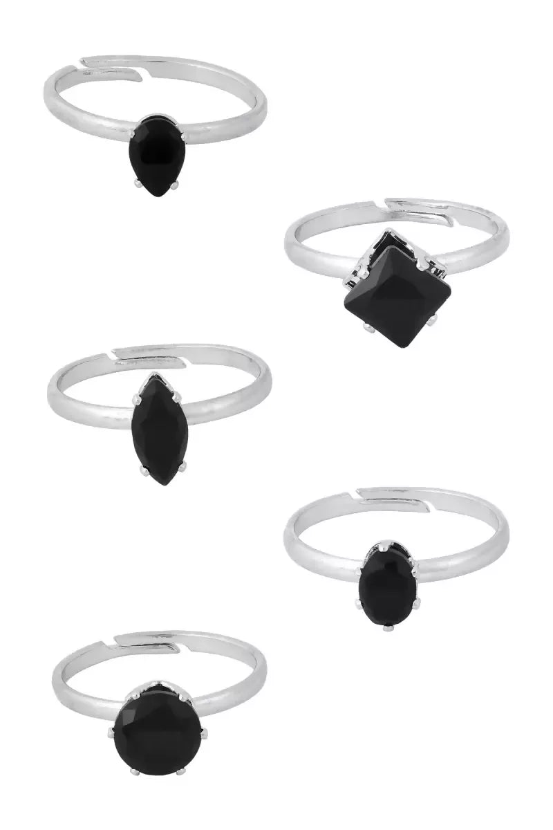 Silver Plated Black Stone Rings Set of 5 (Silver, Adjustable,5 )