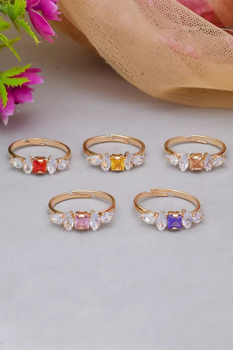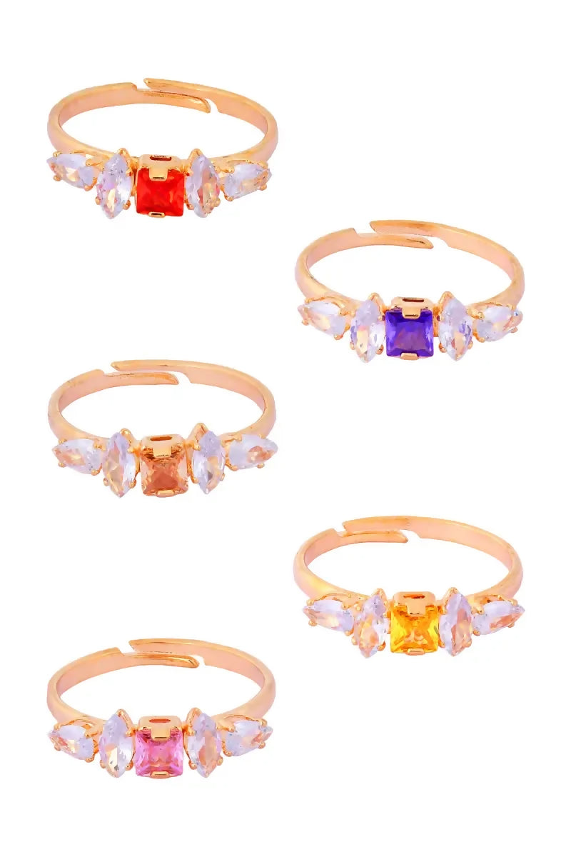 Gold Plated Coloured Stone Rings - Set of 5 (Multicolor, Adjustable, single stone rings )