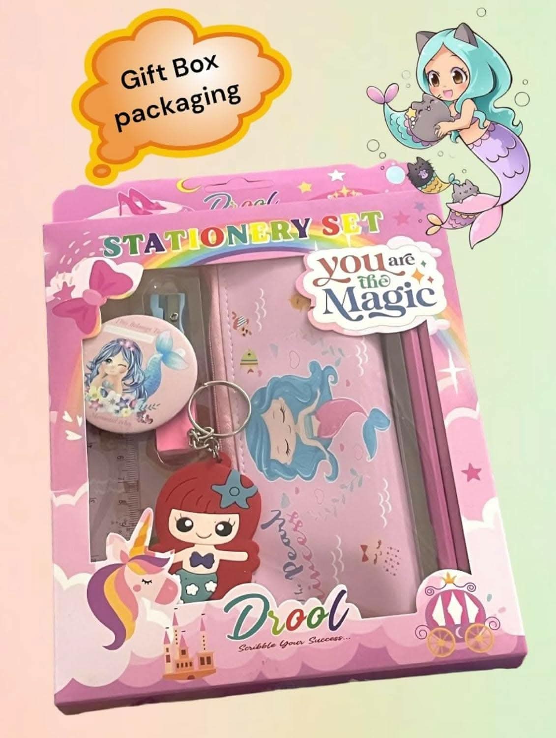 • Doll printed A6 size diary with zipper pouch, pen,pencils, eraser, sharpener ,scale ,badge & keychain